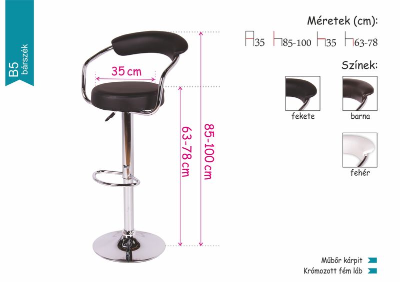 A modern megoldások egyre több otthonban kapnak helyet. A B5 bárszék krómozott fém lábbal, barna, fekete vagy fehér műbőr kárpittal egyértelműen a modern stílusjegyeket magukon hordozó otthonok elmaradhatatlan eleme. Beépített lábtartójával és háttámlájával a kényelemről is maximálisan gondoskodik.